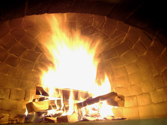 Gwen & Neal’s Open Fireplace/Pizza Oven Combination, Owen Sound, ON This is a combination of an open fireplace and a dome bake oven in a circular shape. The oven’s hearth (baking area) is 30” in diameter. Finished shape radius is 27 ?”. The fireplace is vented through the oven through two channels with two Finnish-made dampers to shut off fireplace when the oven is in use. There is also a drop-in firebrick slab in the shape of the damper opening in the oven that may be dropped into the dampers void to fill the gap and to create a full hearth for the time when the fireplace is not in use and the oven is used on a constant basis. The combination is vented through a single 8”ID insulated double wall section of stainless steel chimney to reach an existing outside chimney and further up the masonry chimney in 8”ID stainless steel liner. Total height of the chimney from the fireplace floor is about 16ft. Height of the hearth in the oven is 48” from the floor level. Height of the fireplace hearth is 14”. Fireplace opening is 28”Wx18”H. Oven’s opening is 18 ?”x 11”. The beautiful oven door is custom made at a local metal shop. Door is made from mild steel with stainless steel trim and locking mechanism. The fireplace has a straight back wall and angled breast arch pieces. The oven is heavily insulated with mineral wool. Outside finish is smooth painted stucco with black granite trim. |