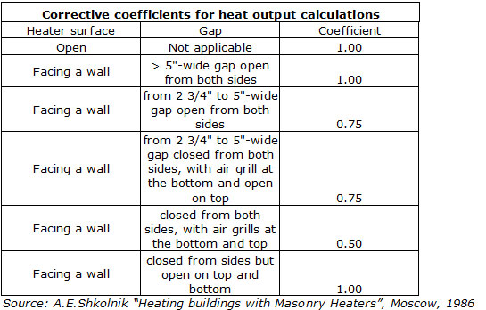 A rule of thumb for rough estimation of heater?s output says that one square foot of a heater?s surface will emit about 185Btu per hour under two full loads per day firing schedule. If we have a heater wall that is facing 4?-wide niche closed from both sides with some vents at the bottom and the top, heat output of the wall will be reduced by 50% according to the above table. If this wall is 4?x8? (32 sq ft of surface), it will have heat output of 5920Btu per hour if the wall is open. In the niche described above, however, its heat output will be reduced to 2960 Btu per hour. This is how much of the possible heat output we lose with such location. Heat output of a heater?s wall located right next to a non-combustible partition will be lost completely resulting in large reduction in the heater?s overall heat output.