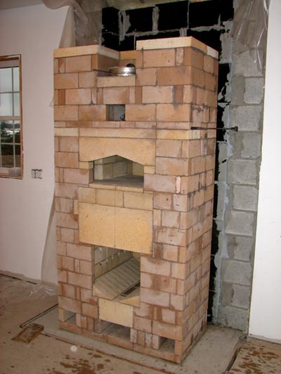 The solution for most units for family baking is quite simple: we build a unit that is essentially a symmetrical single- or double-bell heater with enlarged direct bake oven, by-pass damper, and insulate it between the core and the facing as desired by the client. Most of the units built were insulated on three sides leaving only front wall of the facing to transfer heat to the room. As typically these units are built inside kitchen, insulating helps to keep counters and other furniture cool and improves heat retention of the bake oven chamber. Bake oven chamber, being located at the top portion of the bell, keeps heat for a long time due to buoyancy effect.