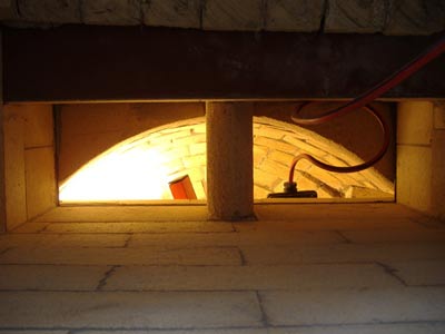 There are two symmetrical exits to the bell from the bake oven chamber at the front. The sidewalls of the bake oven chamber are sloping inward on the last row for better support of the capping tiles and to induce favorable turbulence inside the oven chamber. It has been noticed that direct bake oven chambers that have smooth transition between vertical walls and capping allow for better flame/gases path that results in overall cleaner surfaces inside the chamber. The flames don't break up at inside corners, but instead keep rolling inside burning most soot out from the walls.