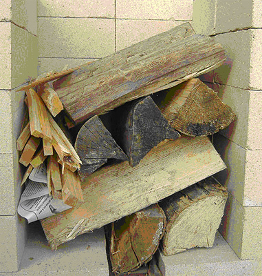 . Fuel loading and starting technique used in all test runs is "side-top kindling" developed by Norbert Senf. (see picture). Observations and test results proved substantial benefits of such technique. Logs get ignited from a top corner, and flames travel gradually in a diagonal pattern to eventually ignite all the pile, resulting in low start-up emissions in comparison with the "old way" (kindling and paper is placed underneath the logs).