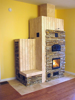 | Treat’s heater, Picton, Prince Edward’s County, ON. This heater is a retrofit into an existing energy efficient country house. The heater features a direct bake oven, advanced BIO-firebox, and heated bench with heated back. Facing is done with thin natural stone veneer and limestone tile over concrete block. | |||||||