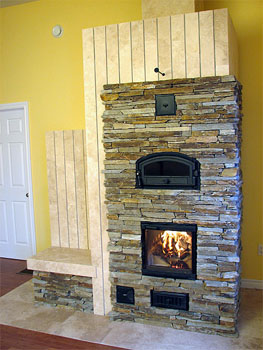 Treat’s heater, Picton, Prince Edward’s County, ON. This heater is a retrofit into an existing energy efficient country house. The heater features a direct bake oven, advanced BIO-firebox, and heated bench with heated back. Facing is done with thin natural stone veneer and limestone tile over concrete block.
