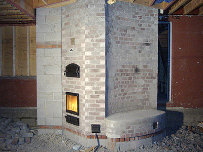 Kaufman's two-level heater Toronto, ON. This heater's design was inspired by modern German kahelofens. The client will finish current rough-brick facing in stucco and custom tiles later. This two-level heater has unusual shape and features a direct bake oven, an oval heated bench, wood storage, and another heated bench with heated back at the second level. The bench at the second level is heated by hot air circulating through special channel between core and the facing at the lower level.