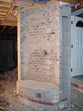 | Kaufman's two-level heater Toronto, ON. This heater's design was inspired by modern German kahelofens. The client will finish current rough-brick facing in stucco and custom tiles later. This two-level heater has unusual shape and features a direct bake oven, an oval heated bench, wood storage, and another heated bench with heated back at the second level. The bench at the second level is heated by hot air circulating through special channel between core and the facing at the lower level. | |||||||