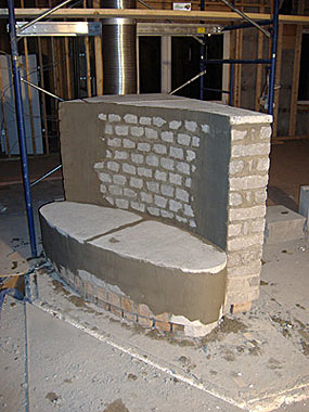 Kaufman's two-level heater Toronto, ON. This heater's design was inspired by modern German kahelofens. The client will finish current rough-brick facing in stucco and custom tiles later. This two-level heater has unusual shape and features a direct bake oven, an oval heated bench, wood storage, and another heated bench with heated back at the second level. The bench at the second level is heated by hot air circulating through special channel between core and the facing at the lower level.