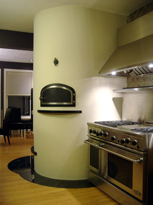 | Gwen & Neal’s Open Fireplace/Pizza Oven Combination, Owen Sound, ON This is a combination of an open fireplace and a dome bake oven in a circular shape. The oven’s hearth (baking area) is 30” in diameter. Finished shape radius is 27 ?”. The fireplace is vented through the oven through two channels with two Finnish-made dampers to shut off fireplace when the oven is in use. There is also a drop-in firebrick slab in the shape of the damper opening in the oven that may be dropped into the dampers void to fill the gap and to create a full hearth for the time when the fireplace is not in use and the oven is used on a constant basis. The combination is vented through a single 8”ID insulated double wall section of stainless steel chimney to reach an existing outside chimney and further up the masonry chimney in 8”ID stainless steel liner. Total height of the chimney from the fireplace floor is about 16ft. Height of the hearth in the oven is 48” from the floor level. Height of the fireplace hearth is 14”. Fireplace opening is 28”Wx18”H. Oven’s opening is 18 ?”x 11”. The beautiful oven door is custom made at a local metal shop. Door is made from mild steel with stainless steel trim and locking mechanism. The fireplace has a straight back wall and angled breast arch pieces. The oven is heavily insulated with mineral wool. Outside finish is smooth painted stucco with black granite trim. |