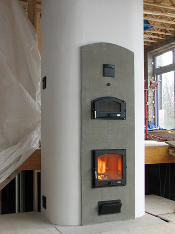 Lisa and Gord’s Heater, Woodstock, ON This masonry heater with curved front face was built for an energy-efficient country residence. The heater features new generation see-through firebox design and direct “black” oven. The unit is finished with smooth stucco. The clients will have the front relief portion finished in custom ceramic tiles at a later date. |