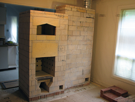 | Sergei’s Heater, Sutton, ON This unique large heater, designed by Alex Chernov and built by Alex’s apprentice Sergei Kuznetsov in his own house features direct black oven and two large warm air ducts, providing constant flow of warm air for the second story. Air flow in the ducts is maintained by natural draft (gravity). Design of the heater is based on Igor Kuznetsov’s (www.stove.ru) conceptual idea for this type of heaters. The second bell in this heater is located at the side as opposed to normal position at the top of the first bell. | |||||||