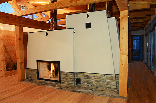This unique and complex contemporary-style heater was designed in collaboration with the owner of the house - architect Margaret Dabrowski of Studio Linea Architect http://www.studiolinea.ca/. The heater features black oven, a large heated bench with heated backrest, and a 3x3ft open fireplace built into the heated backrest. It also incorporates a transit chimney from a wood-burning fireplace insert at the lower level. The heater is finished with smooth stucco and slate trim.