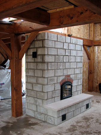 | Jeff’s Heater, Port Colborne, ON This large see-through heater capable of the output of 30,000Btu hr features the newest firebox design, direct black oven facing the dining room, a heated bench at the living room side, and two hot air ducts leading to the master bedroom on the second story. The heater’s rough facing is done in concrete block that will be finished later with natural thin-stone veneer by the client. |