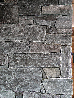 Symmetrical heater faced with lightly polished limestone tiles and “Corinthian Granite” natural thin-stone granite veneer from Champlain Stone. The heater features a direct bake oven, and an advanced clean burning BIO-firebox. The heater is built in an old modular cedar log cottage renovated to become an energy-efficient eco-friendly family home.